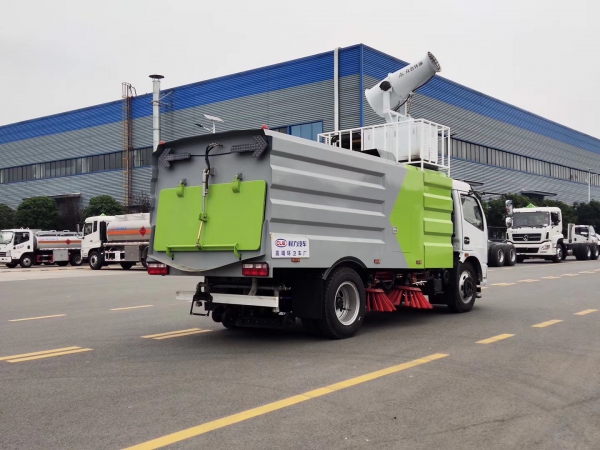 后喷雾:在洗扫车后部垃圾箱下方配有喷雾喷杆,喷雾喷杆上装有多个喷雾喷嘴。启动副发动机和高压水泵,打开后喷雾开关,启动底盘车前行,就可进行喷雾降尘作业。